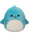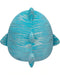 Squishmallows Lamar valashai -pehmolelu. Ihana turkoosinsininen väritys hopeanvärisillä raidoilla.